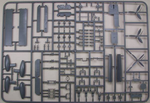 This kit has been around quite a while and I'm not sure what company released it first but I have boxings by Super Model, Italeri and Revell. The Revell kit is a more recent release and the box was in better shape so it got photographed for the review. I also liked the box art even though it's one of those dreaded end flap boxes. The one I plan on building is a Super Model release but it came in an even larger end flap box. Inside the box is one large bag with three large sprues in a dark gray color. The parts feature raised panel lines which seem to be a bit variable in their width and height. The surface is smooth and I found no surface defects on the major air frame pieces. I found no ejector pin marks that will show after assembly. The parts are virtually flash free with only parting lines to deal with on the smaller parts. The interior details are pretty much the standard for older 1/72 kits with floors, seats, control columns and instrument panel. There are some black boxes for the radio compartment and decals for them and the instrument panel. The crewmen feature separate arms and are a bit better detailed than many provided with 1/72 kits. The control surfaces, with the exception of the flaps are separate. The kit includes three small bombs and can be built with a mine detonating magnet ring, however only one aircraft was ever built with the ring. The kit also includes a beaching dolly. Altogether there are 129 gray parts. The clear parts are rather thick and only moderately clear. The turrets are in halves which means seams in clear parts which are never any fun. Altogether there are 15 clear parts for a kit total of 144 parts. See photos below.