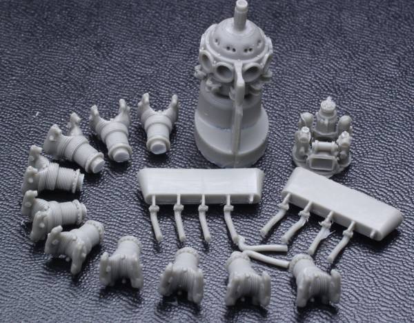Since I really didn't care at all for the kit supplied engines, these little gems from Vector [48-011b] looked like the cats meow. Please note these will not fit the kit nacelles. This is a fairly common problem due to the plastic parts being way over thickness wise but in this case it is made worse due to the fact that the cowlings themselves are undersized compared to drawings I have so new cowlings will need to be made in order to use them. The parts are molded in a gray resin with little to no flash. The cylinders fit into the crankcase easily. While push rods aren't supplied the holes are there in the crankcase and wire can be cut and fitted easily. The wire is not supplied. The parts had no visible pin holes or other defects. See photo below.