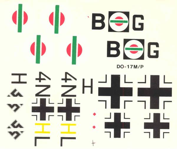 The decals are thin looking and have a flat finish and are in register. They include markings for two aircraft, the swastikas are the assembly variety. No stencils are supplied. I have not heard any complimentary comments made about Hobbycraft decals so buyer beware. See photo below.