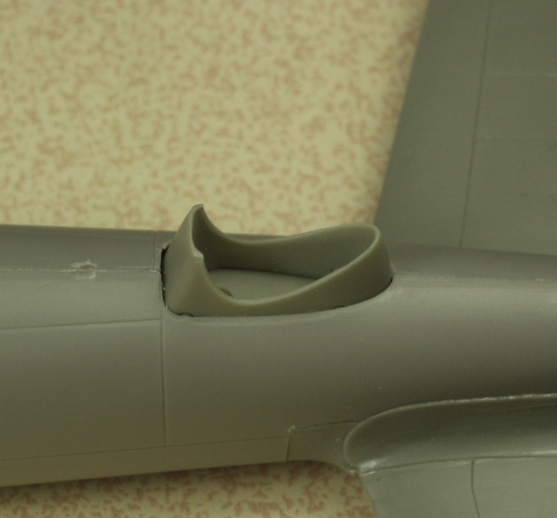A close up showing the fit of the forward portion of the wing to fuselage. The gap between the engine cover and the leading edge of the wing was a bit wider than I would have liked, won't be an issue if left off to display the engine and it may fit better once the nacelle assembly is actually glued together and attached to the wing.