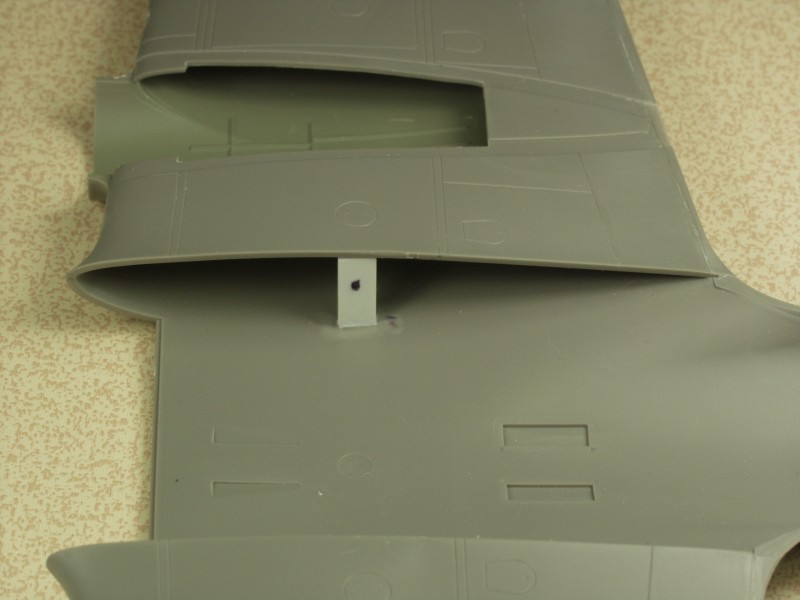 Wing mated to fuselage, again I was pleased with the fit. I had a bit of an interference fit issue with the inside forward bomb bay bulkhead frame. Since the bomb bay wasn't going to be open, the offending area was just clipped off. I did use some filler here and there. The engine cowlings actually fit better than in the test fitting. I still used a bit of filler there though. I added the intake splitters in the two wing openings, shown on the box art and plans I have but not including in the kit using some .010 styrene.
