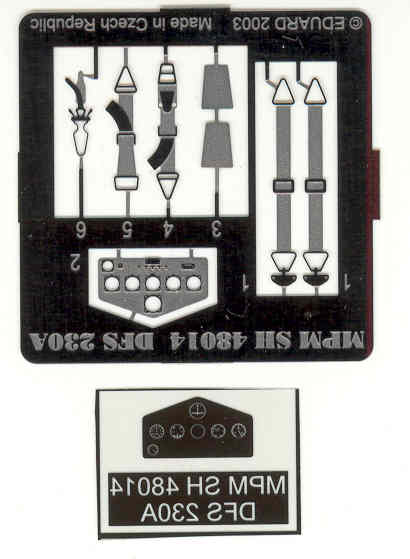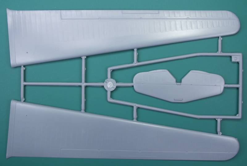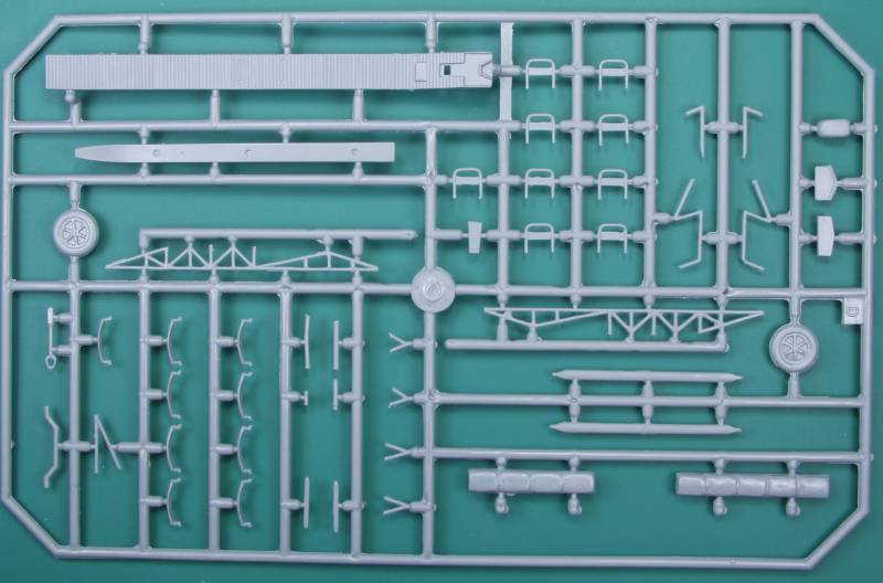 The Special Hobby kit comes in an end flap style box with nice artwork on both the front and back. Inside the box the parts are sealed in a plastic bag. In side the main bag are two smaller bags, one with the decals and photoetch parts and another with resin parts. The clear parts were not separately bagged, certainly not the best of ideas. The kit is molded in a medium gray color. The panel detail, what little there is is recessed. The aircraft featured a tubular steel frame covered with fabric and the wings were wooden forward of the main spar and fabric aft so there really weren't many panels. The fabric detail is almost not dicernible which is how it should be, more manufactures should use this kit as a standard ! The fuselage has framework detail on the inside where it will be seen but there are also some nasty ejector pin towers that will need to be removed. The surface finish of all the airframe parts is smooth and has a matte finish. I found no surface blemishes on any of the airframe parts. They have a light amount of flash. The control surfaces are all fixed. The interior consists of a floor with a frame work that gets attached to it on which the seat cushions are attached along with the seat backs, a control panel, rudder bar, stick and pilots seat, The PE parts include an instrument panel with film and seat belts and harness for the pilots seat. There is also some additional structural details to add. The small parts all have a bit more flash than the larger parts and parting lines to clean up. The wheels, which look a lot like Bf 109 wheels are not weighted. By my count there are 57 parts in gray. See below.