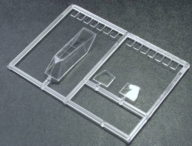 The clear parts were quite clear with only a moderate amount of distortion and feature distinct frame lines for easy masking. Although they weren't packages separately they seem to have escaped damage, at least in my kit. All total there are 17 clear parts. See below.
