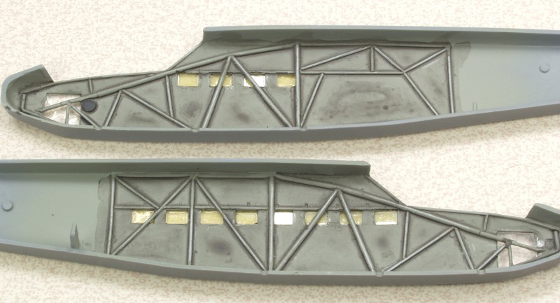 The separate internal bracing pieces were added to the fuselage halves which then had their interiors painted RLM 02 and given a shadow/sludge wash. The instructions would have you wait until after the fuselage is assembled to install the clear parts. I don't think I've ever had a Special Hobby kit that the clear parts actually fit like they should so I decided to do this first. As I suspected the windows were all over sized requiring some sanding on both dimensions to get them to fit. I took off just enough to make them a tight fit then applied Future to both sides going heavy on the inside to act as a glue to hold them in place. The next photo show the fuselage halves after the windows have been installed and mask.