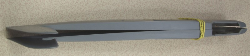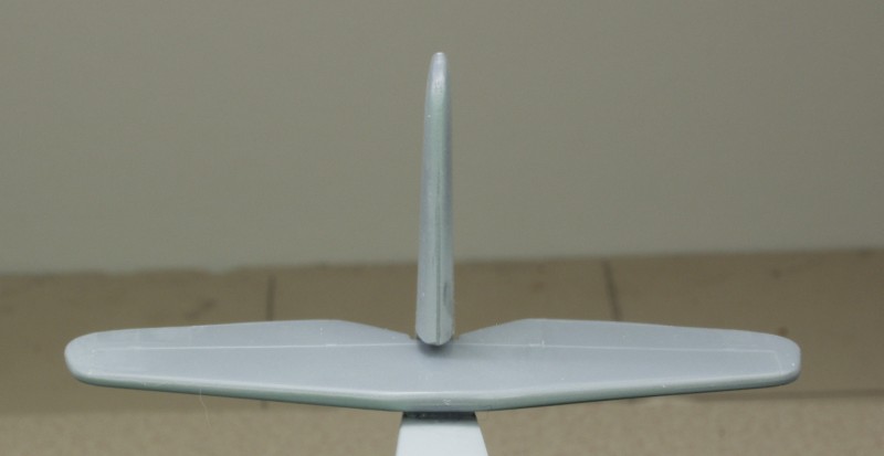 To correct this I cut a slot halfway through the fin and found a thickness of styrene that get it closer to straight.