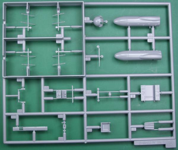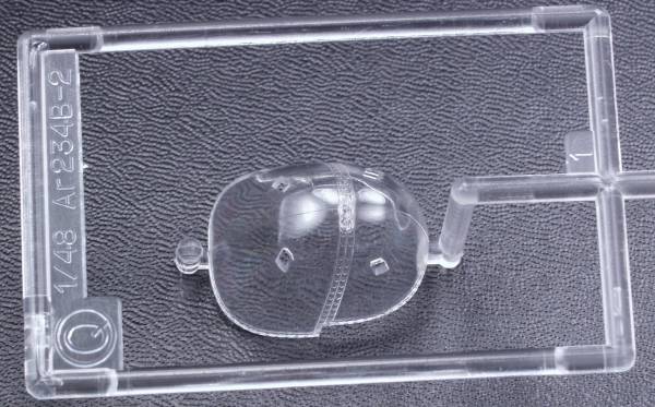 The Hasegawa kit is essentially identical to the kit for the Arado 234B and exhibits good fit and detail with a couple exceptions. The cockpit rear bulkhead is a little oversized and will cause problems closing the fuselage if not filed to fit ahead of time. The other issue deals with the alignment pins on the wings. If used these will cause issues with both the wing tips and fuselage join. The pins are best cut off and the wings aligned and glued together. All other comments that were made in the Ar 234B review apply to this kit as well. The primary changes were accomplished by adding one sprue which contains the seat and instruments for the radar operator, the radar antenna and mounts and the under fuselage gun pod. The clear nose piece was replaced with one having the holes for the radar antenna mounts. These are shown below.