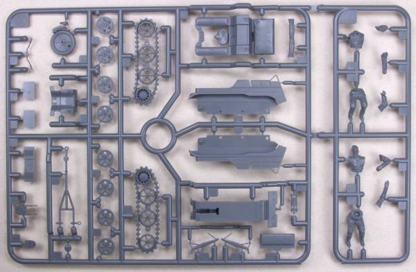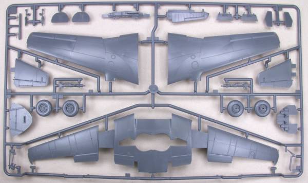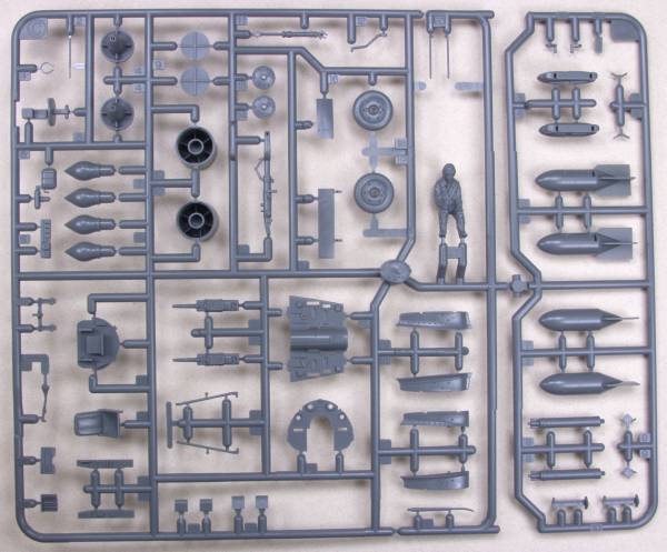 The kit comes with a nicely detailed cockpit and gun compartment as well as alternative tire types for the nose wheel. The kit comes with a pilot figure outfitted for flight or an alternative ground crewman that can set in the cockpit like a crew chief. The control surfaces are all fixed and the leading edge slats are in the retracted position. This is a major bone of contention among many 262 zealots as these slats were always open when the aircraft was stationary on the ground. The kit comes with the kettenkraftrad which is a kit in itself, It is very nicely rendered and can be used in conjunction with any Luftwaffe aircraft for diorama purposes. Altogether there are 155 gray parts for the aircraft and 37 for the kettenkraftrad for a total of 192 parts. See photos below.