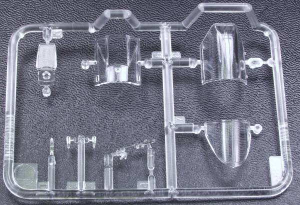 The canopy is a vacuformed part and only one is supplied so one must cut carefully. The kit windscreen is used. The part is thin and clear with raised frame lines. See photo below.