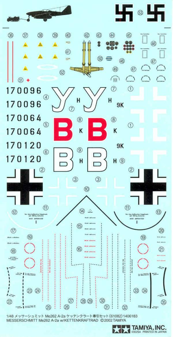 The decals are the typical fair from Tamiya , just a tad on the thick side. They are well registered and include markings for three aircraft. There is a good collection of stencils, wing walk markings, instrument panel gauges, harness and seat belts and swastikas. See photo below.