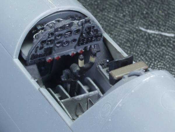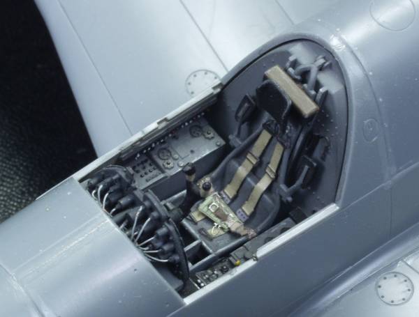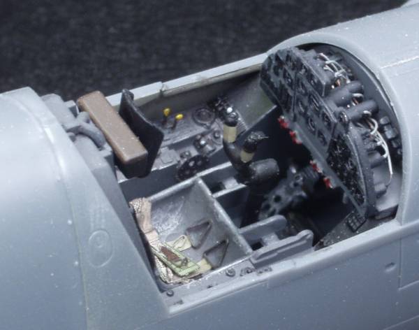 I'm not going to go into great detail here as this kit has been well covered on other sites. The following are a couple photos of the cockpit area. I used most of the supplied PE parts and added wiring behind the instrument panel.