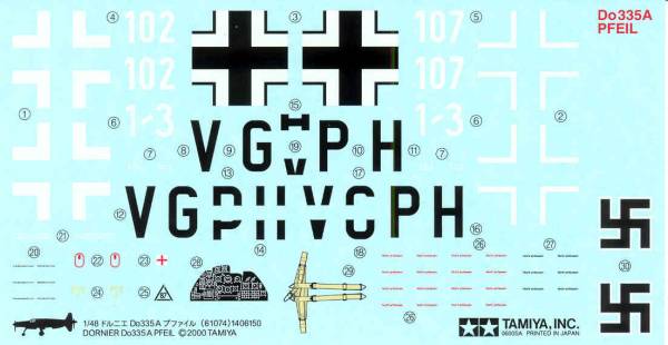 Decals are provided for three aircraft, only one carries radio call sign numbers, the other two only have tail numbers, the balance of the marking are the same for all three aircraft. The decals are a medium thickness and in register. The decals include the seat harness and belts and a panel decal as well as swastikas. There is a reasonable amount of stenciling and its all readable. See below.