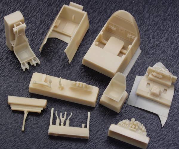 The set includes a one piece resin molded cockpit tub that is quite amazing in its complexity and level of detail. Also included in resin are the instrument panels and fittings for both cockpits, forward cockpit bulkhead, pilots ejection seat, and the instructors cockpit. The parts are molded in a tan colored resin and are crisply molded with no air bubbles present where they would be seen. Two parts were off their pour stubs and missing in action, the canopy release and ejection levers. Also one of the instructors rudder pedal cylinders was broken off the rudder pedal mount. Photos of the parts are shown below.