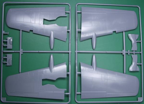 The Tamiya kit is mostly identical to their A-0 version with the addition of the parts that were different on the B-2. This consists primarily of the wings and a totally new sprue with new wings and new main gear doors. The larger tires used on the B-2 required larger bulges on the gear doors. Some additional parts were added to sprue E, labeled L it includes the larger nose wheel that was used on the B-2 as well as the muzzle brakes for the Mk 103 cannons, a fuel tank for the Bomb bay and a slightly different instrument panel for the cockpit. Two additional clear parts are supplied, the main canopy with the blown bubbles for rearward vision. The original clear parts are included as well. Refer to the A-0 review here for comments concerning the quality of the parts and photos of the rest of the sprues. The kit contains about 14 additional parts in gray and two clear parts. See the photos below for parts exclusive to this kit.