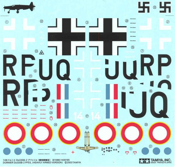 The decals are moderately thin and include two sets of markings for the same aircraft. The German set for the late war and French marking for post war. The decals are in register, include some stenciling, seat harness and belts and instruments for the instrument panel as well as swastikas. See below.