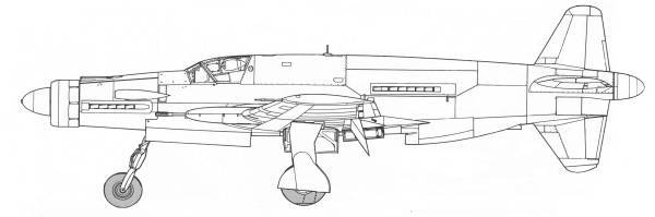 The Do 335B-2 was to be a heavily armed Zerstorer which would be based on the M13 and M14 prototypes. It's main feature was two wing mounted 30 mm Mk 103 cannons contained in special fairings with 70 rounds per gun in addition to the normal engine mounted Mk 103 and two 20 mm MG 151/20's under the nose cowl. The B series also standardized on larger tires which required the nose wheel to rotate 45º for stowage during retraction and an armored windscreen. The M13 was first flown on October 14, 1944. The M14 was completed in late 1944 and captured by the French at Mengen airfield and subsequently tested over a period of three years after the war. Production of the B-2 was to be done at the Heinkle works in Oranienburg but due to numerous problems none were delivered until February of 1945. It is uncertain how many were actually begun prior to the end of hostilities.