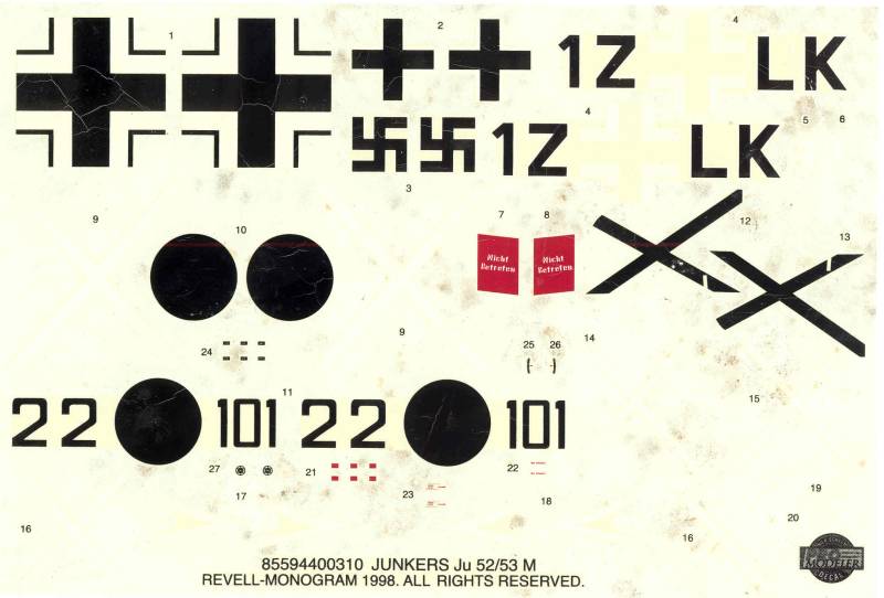 The decals in my kit apparently were subjected to moisture at some point and are trashed. The kit came with marking for two aircraft, one from a Spanish Nationalist Grupo and the other from Greece in 1941.