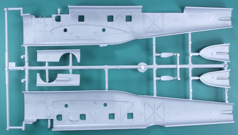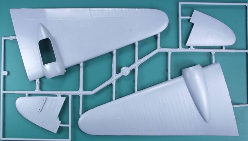 The Special Hobby kit comes in an overly large top open tray type box with a thin top and a bottom half made from thin corrugated cardboard adding some strength to an otherwise flimsy box. The top has some reasonably nice artwork on it. On the inside there is an insert that has a sleeve holding the decals and two small bags containing resin parts stapled to it to keep them safe from the balance of the parts. The rest of the parts are in are in three resealable bags, one large with the wings, fuselage and tail parts, one medium sized bag with the balance of the parts except for the clear parts and a smaller bag with just the clear parts. The main parts are molded in a gray color and the finish is smooth and varies from glossy in places to matte in others. Much of the aircraft is covered in fabric and Special Hobby did a good job capturing this in a subtle manner. The molding is good for a low pressure injection molded kit, there is some flash present. The surface detail where the areas are metal feature fine recessed panel lines which are mostly uniform. I found a couple places where they disappear that will need to scribed. The sprue attachment points are heavy in some places. The control surfaces are all molded in the neutral position and as is the case on many short run kits the demarcation line for these could stand to be scribed a bit deeper. Looking over the main air frame I only found a couple defects. One was near the nose on the starboard side. Not really a sink recess, more like some sort of plastic flow anomaly. Not all that deep but it will need to be filled. as one might expect with this type of kit the mold separation lines are heavier than on most main stream kits and that is true here as well.