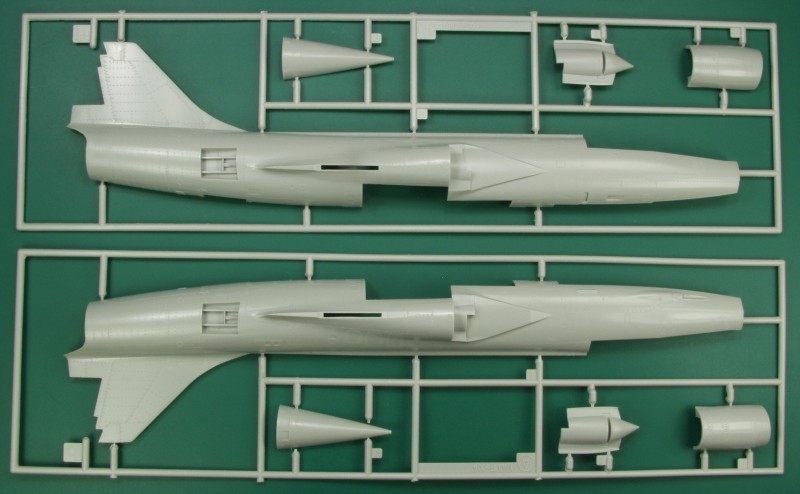 First up are the fuselage half sprues which also have the nose cone halves and intakes. One can see the interior structure detail for the air brakes. There is a small vent below the cockpit area that is molded open and the gun port is also molded open.