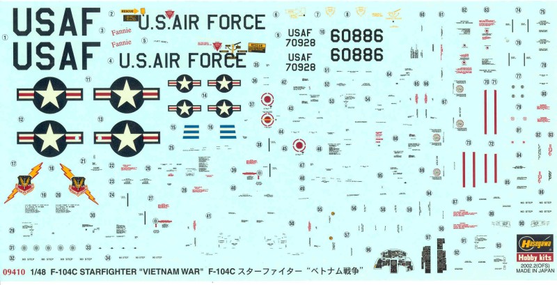The decals are typical Hasegawa for the time period, the white is more of a cream color though it doesn't show well in this scan. They are also a bit thicker than what you find on after market sets. The decals provide marking for two aircraft, both from the Vietnam era, one in camo and one natural metal, both from the 479th TFW, the natural metal one from the 1965 deployment and the other from the 1968 deployment. As you can see there are a ton of stencils. The decals are are nicely printed and in register but have a lot of excess film with them and I have had mixed results using Hasegawa decals. Since these are 15 years old I will probably go with an after market set.