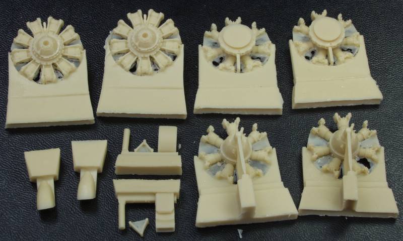 There are two bags of resin parts with the kit, one of these contains the two different engines that come with the kit plus a couple different intakes and the torque scissors for the landing gear. The parts are molded in a tan resin. The detail level is good but there will be a lot of flash to clean up. Some of it is thin and easily removed but some is not and the pour blocks will require some effort to remove without damaging the cylinder heads. The push rod detail on the single row radials is very nicely done and over all I did not find a lot of bubbles or other defects and once cleaned up and painted they should look quite nice. See photo below.