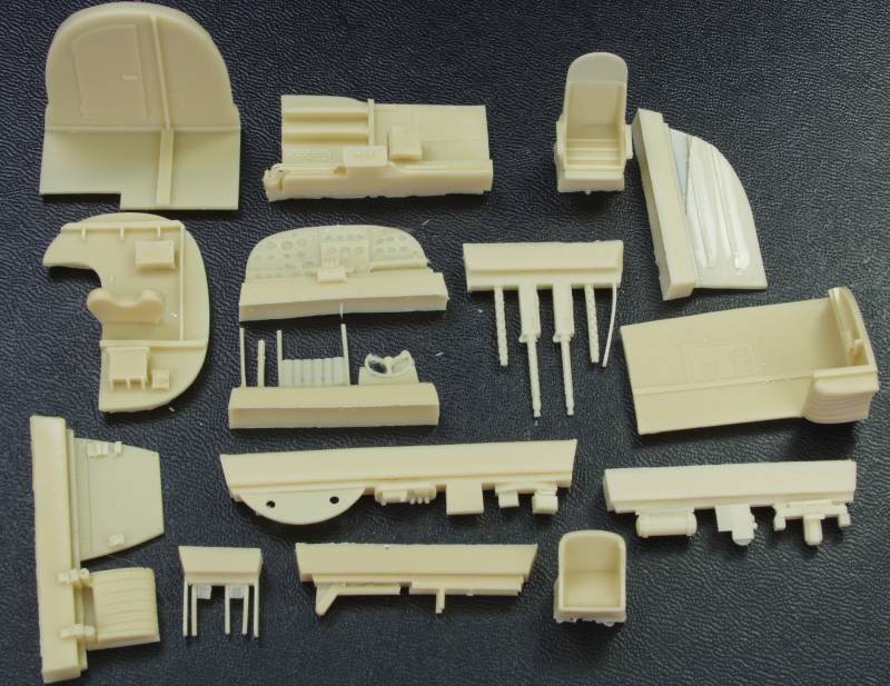 The other bag contains the parts for the interior. These include bulkheads, seats, the instrument panel, control column, guns and other fiddly bits to dress up the cockpit. No interior parts are included for the fuselage area behind the pilot but this area will not be easily seen anyway. These parts had much less flash than the engines are were free of pin holes and surface defects. Altogether there are 46 cast resin parts. See photo below.