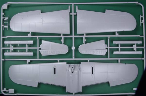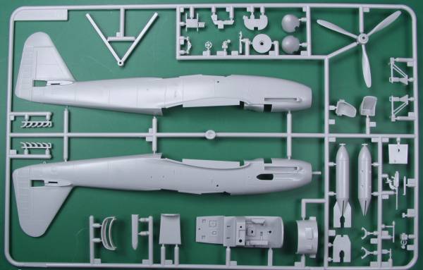 The Tamiya kit is one of their later offerings and is first rate kit. I was drawn to it by its sleek lines and was not put off by the fact that it was never used in combat. Since reviews seem to be a bit scarce for this kit lets take a look at what is in the box. The kit comes in a nice two part top opening box with nice artwork on the top. Inside there are three plastic bags. Two of them have one set of sprues and the third has two identical sprues which are for the floats and beaching dolly. The clear parts are bagged separately and are included in on of the single sprue bags. The parts are molded in a light gray plastic with crisp fine recessed panel lines and raised detail where applicable. The fabric surfaces may be a tad over done but they look OK to me. I could not find any sink marks or flaws in the any of the exterior parts. The cockpit is very well detailed with lots of add on parts. The inside fuselage has structural and other detail molded into the cockpit sidewalls but unfortunately there are about a half dozen ejector pin marks that are that area and some of them will undoubtedly show when the kit is complete. The clear pieces are thin and clear with well defined frame lines. The canopy is molded in two pieces, the windscreen, of which two are suppled, and the balance, which means it will need to be cut to display in the open position. The windscreen has both a solid one for use with the reflector style gun sight and one with a hole in it for a telescopic type gun sight. Also included with the kit is a metal weight which goes inside the forward end of one of the floats to prevent tail sitting. All the control surfaces are fixed except the flaps which can be positioned up or down. There are also two different spinners included, one slightly more pointed than the other but there is no information regarding usage of one over another. Two nicely molded crewmen are included but they are both identical. A beaching dolly is included and it's a nice model itself. One bomb as an external load is included. All together there are 74 pieces in light gray and 5 clear pieces for a total of 79 plastic parts. See photos of sprues below.
