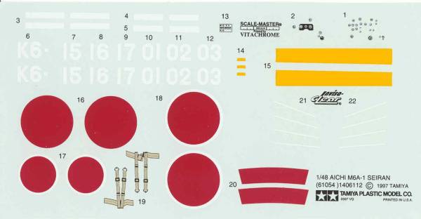The decals supplied allow you to build anyone of the six aircraft that were actually dispatched on a mission. Besides the national markings and aircraft numbers the sheet includes a serial number plate, seatbelt/harness decals, instrument panel and various striping that goes on the floats. One set of stripes supplied is not show in the instructions or the box top but are shown on the tops of the horizontal stabilizers in the photo of the assembled kit on the front of the instruction sheet. The decals are by Scale-Master and printed by Vitachrome and appear to be thinner than some Tamiya supplied decals. The most noticeable problem with them are the red national markings with white surrounds, the red is not centered in the white. These would probably be best replaced or painted on. See sheet below...