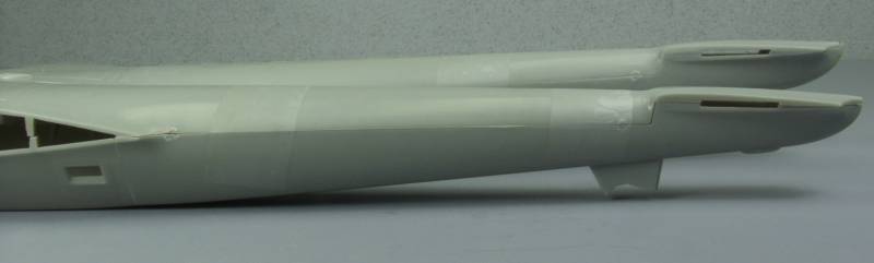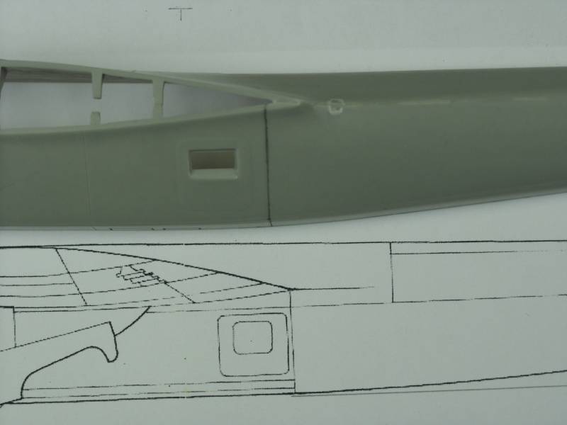 On the drawing, the point where the transition from the flat portion of the bottom of the fuselage to the taper to the tail, falls at the point where the trailing edge of the wing fillet meets the fuselage. On the model this point is slightly forward of that point but the panel line and access door is more forward than shown on the drawing as well. This is difficult to see in most photos because of the angle of the photos and I read some where that there was some variation in the placement of the doors so I'm not going to argue the point until such time as I see more proof. The panel line that is there, is reasonably perpendicular to the bottom of the fuselage and seemed to me to be a good place to hide a cut line. See the photo below for comparison to the drawing, the panel line has been darkened for emphasis.