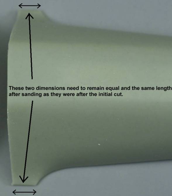 You want to remove material from the closed bottom of the fuselage tapering to the top and not the open top. If scribing a line or making a mark with a pencil or fine tip marker will help, by all means do so. You want to do this in such a manner as to keep the surfaces square to each other, if you don’t you’ll end up with the tail biased left or right. Measure the distance of the wing fillet shown in the photo below immediately after making the cut. These should remain equal and the same or close to the same length when you are finished as they were when you started.