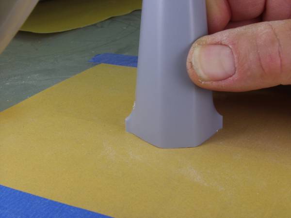 I taped a piece of 320 grit sand paper to a glass plate and ran the cut edge of the forward section over it lightly to smooth the cut and remove and burrs. Easy does it here, as you really don’t want to change the angle of this surface.