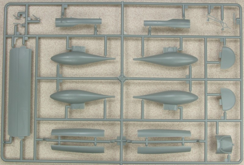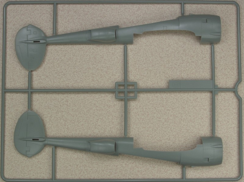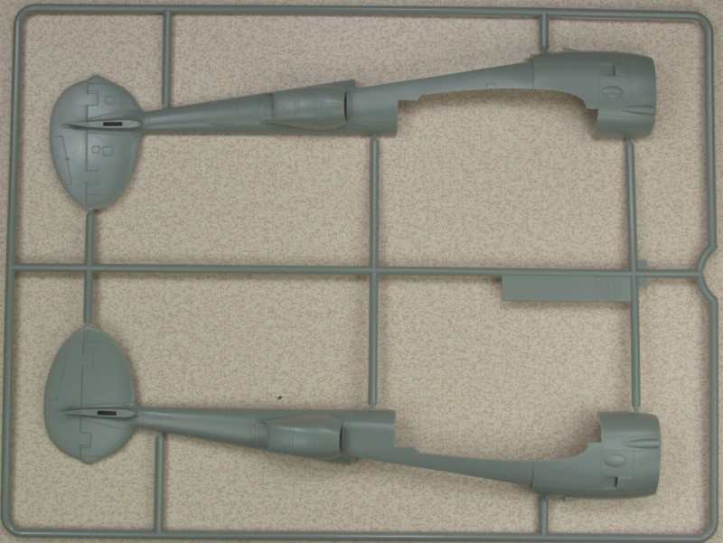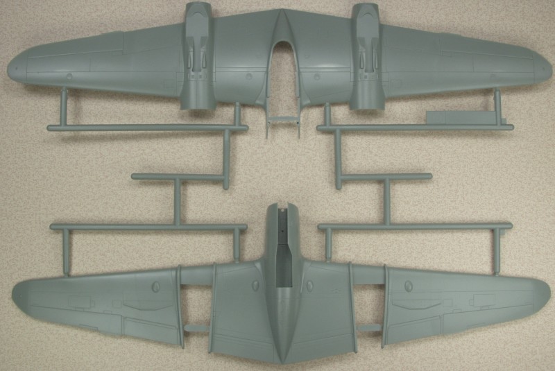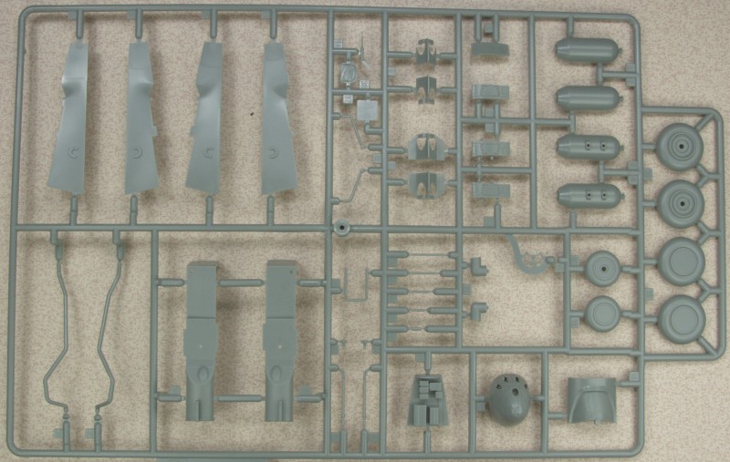 The Academy kit comes in a fairly large box for a 1/48 scale kit. It's a top open tray type box with a thin card stock top and a bottom half made from thin corrugated cardboard . Inside the box which is pretty well full of sprue trees one finds six sealed bags of which all but two contain two or more sprues of parts. The parts are molded in a light greenish gray very similar in color to RLM 02 green. The parts are crisply molded with only a hint of flash here and there. Mold alignment looks good with only an average amount of mold misalignment and mold seams to deal with. The parts surface is smooth and detail consists of recessed panel lines and some raised rivet and fastener detail. Panel lines are pretty much average for the scale and are consistent. The control surfaces are all molded in the neutral position. The only ejector pin marks I found that would show were on the main gear and nose gear struts. Looking over the airframe parts the only surface defects I found were a couple of places where there might have been some dust or dirt on the dies and these were raised and should be easily sanded away.