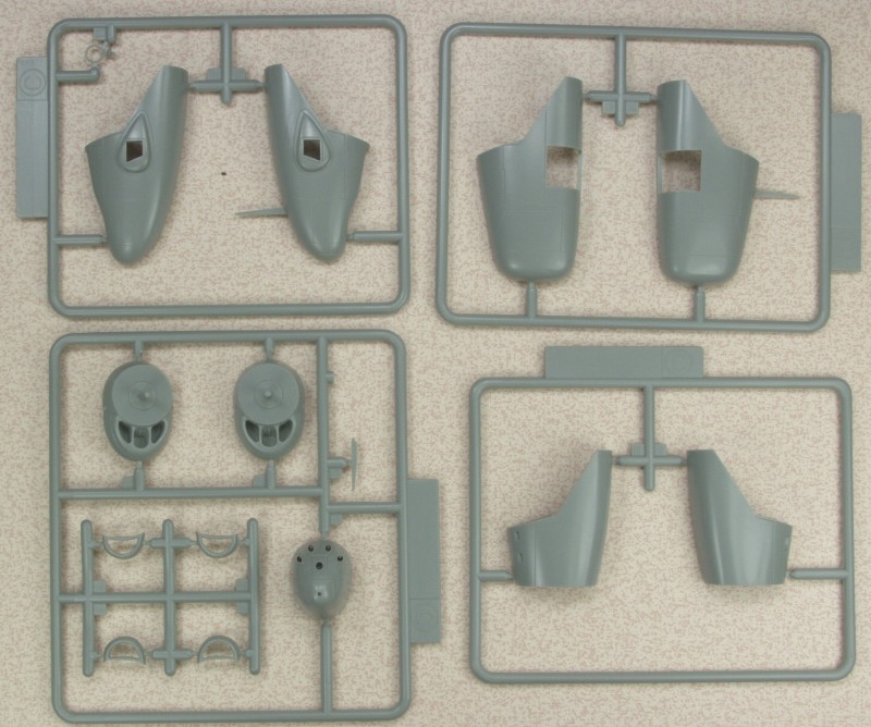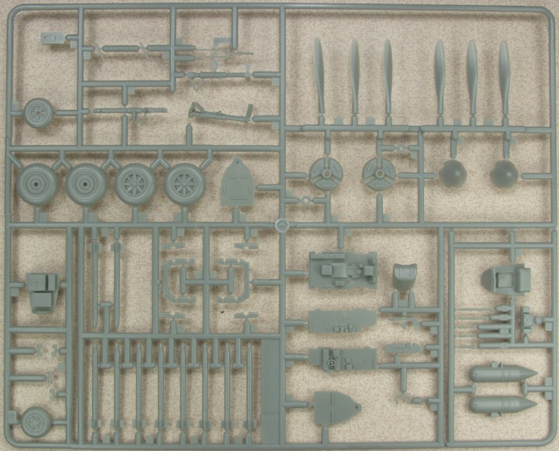 From a detail standpoint starting inside, the cockpit is OK in that it has most of the major parts there but the detail level is a little light. Probably enough detail to satisfy most. The gear bays are boxed in and include some of the coolant system piping and considering how little of them can be seen are good enough in my book. The main gear doors have some nice detail on them and they will be more visible than any thing else. Two complete sets of wheels are supplied. One set has smooth treaded tires and wheel covers, the other has treaded tires and no wheel covers. Both sets are in halves and are not weighted. The kit comes with four different noses, three molded in kit color and one in clear. One each for the J, J droopsnoot, L pathfinder and F-5E Photo recon. The J droopsnoot is in clear which eliminates the need to have separate clear parts for the nose. The instructions say 20 grams of weight is needed to keep the nose down but I am never totally trusting so doing so balance testing before closing things up is a good idea. A good assortment of armament is supplied, two racks with five HVAR's, two 500 pound bombs, two three tube bazooka style rocket launchers and two drop tanks. A load out chart for the different versions is provided. The propellers have separate blades which are keyed for pitch, one must remember they rotate in opposite directions when it comes to mounting them. OK, lets look at the parts.