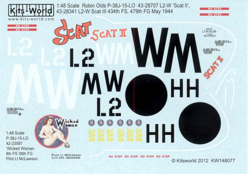 And finally some after market decals, I decided I wanted to do something different and chose a set which included markings for Robin Olds aircraft. The Kits World sheet actually has markings for four different aircraft that he flew while with the 434th FS, 479th FG. Three are OD over neutral gray, one with invasion stripes and one in natural aluminum. The fifth aircraft that can be done with this set is a NMF aircraft flown by Lt, McLawson with the 36th FS, 8th FG. The sheet is actually rather small as it depends on the kit sheet for the national markings. The decals appear thin and sufficently opaque with minimal clear surrounds. Registration really isn't an issue. The sheet contains some small stencils that really aren't addressed in the rather smallish sheet of instructions so some reference photos would be really helpful. I have not used any Kits World decals so I can't comment on how well they will work.