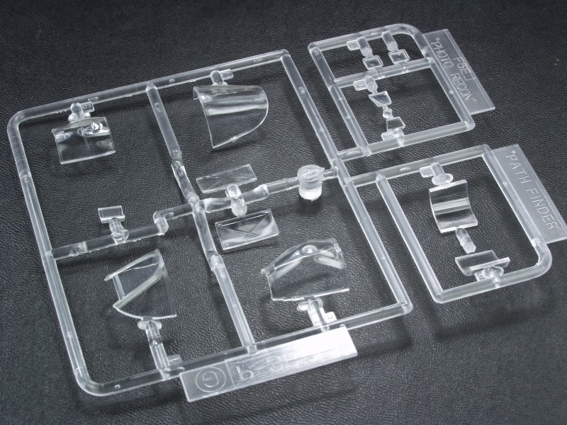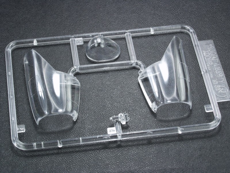 The clear parts are of medium thickness and exhibit some optical distortion but should look OK after a dunk in Future. The center area is made up of three separate pieces.
