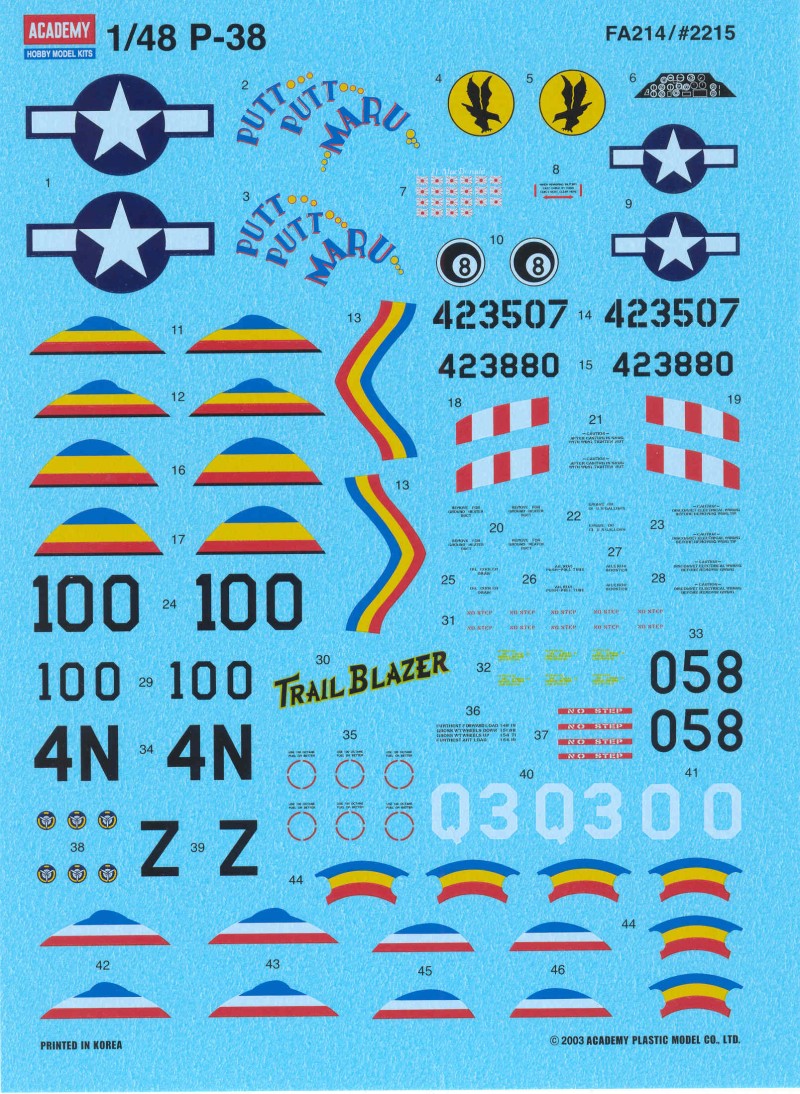 The decals have a glossy finish, are in register and have good color density. The sheet provides markings for five aircraft, one for each version supplied in the kit; P-38J, flown by Col. Charles H. MacDonald, CO 475 FG (Putt putt Maru), P-38J Droopsnoot, (no info supplied), P-38 L Pathfinder (no info supplied), F-5E Photo recon, (no info supplied).