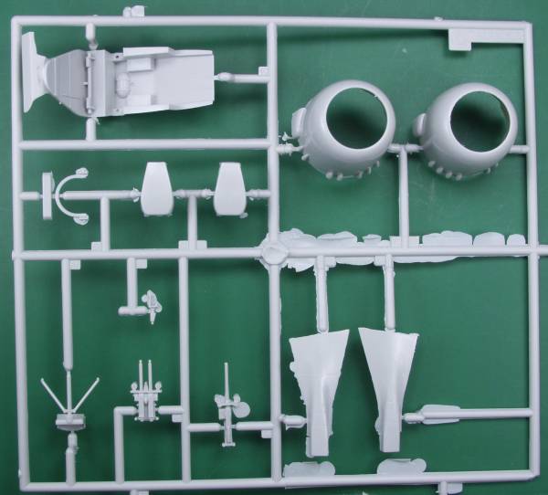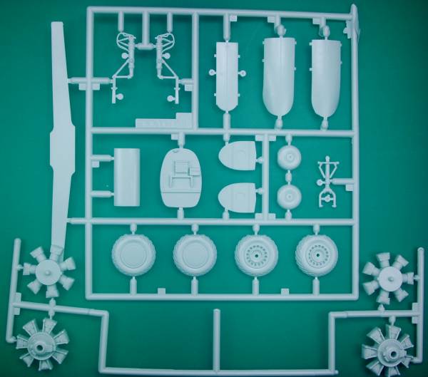 One issue with the kit is that of the radar operators position. In the P-70 he sat in the rear gunners location. AMT include the normal gunners position which comes from the A-20 kit and made no effort to duplicate the radar operators equipment. The landing gear struts are nicely rendered including brake lines. The gear doors are molded in the closed position and need to be cut to use them with the gear down. Mounting them is fiddly as they have mounting tabs but there are no slots to fit them into so it's just a butt joint with the correct alignment left up to the builder. The engines aren't bad but we'll discuss options there as well later in the review. The wheel wells are boxed in and have some detail in them. The shell ejection chutes in the lower gun tub are open but the openings for the guns are just half hearted indentations. There is a spar that fits through the fuselage that will aid in getting the wings set to the proper dihedral. Altogether there are a total of 74 gray pieces. The clear parts are thin but only moderately clear, a coat of Future should help. Both the pilot's canopy and gunners position are two part so they can be displayed in the open position. Altogether there are 9 clear parts bringing the total to 83 parts. See photos below