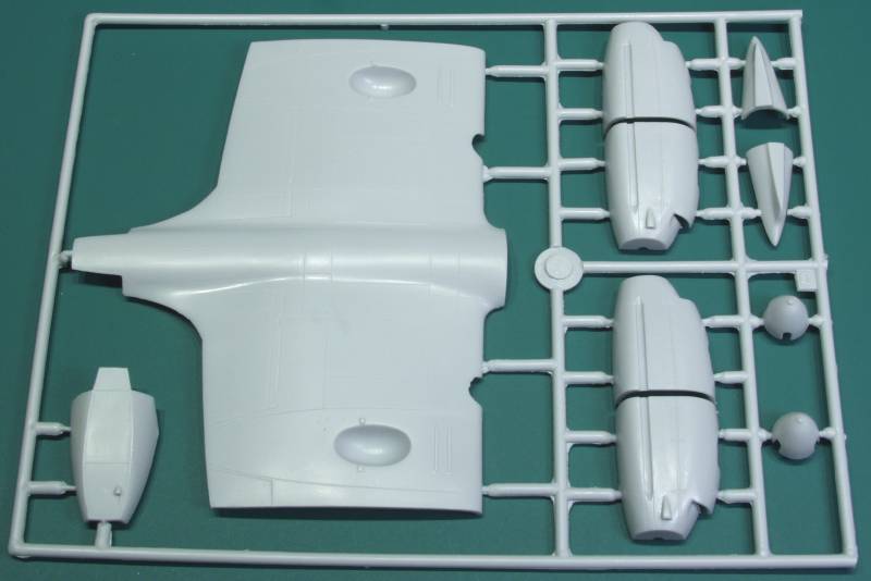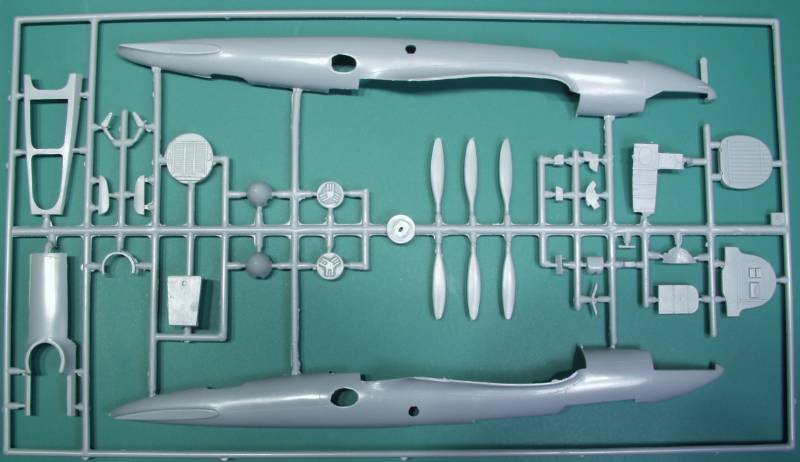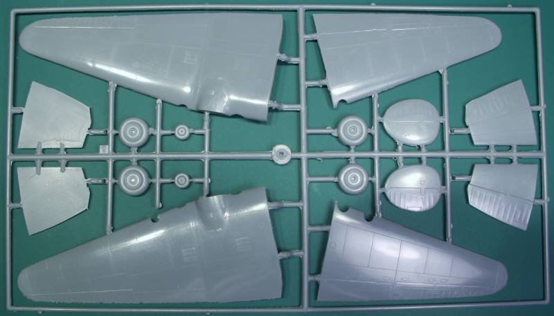 The MPM kit comes in one of those unhandy end flap boxes with reasonably attractive artwork on the front. Inside the box is one large bag containing all the parts with two small bags containing resin parts and the decals which were also bagged. The clear parts, both injection and vacuformed were not separately wrapped. Three of the sprues were molded in a gray colored plastic while a forth was molded in an off white color. The parts feature recessed panel lines, some of which are so fine that they may disappear under a coat of paint. There are some fastener and louver details that are recessed as well. All of the parts exhibit a moderate amount of flash, in a few cases it is a bit heavy and some of the sprue attachment points are heavy and will require care when removing them. The control surfaces are all fixed in the neutral position and the lines delineating them are only slightly larger that the panel lines and could stand to be made deeper with a bit of scribing. The surface is generally smooth but have rough areas in places either from the mold parting compound of the molds were just dirty. I did not find any sink marks on the exterior surfaces but there was one wavy spot on one wing and some sort of a slight scratch on the other. There are one or two ejector pin marks that may show in the cockpit area. Fortunately the insides of the gear doors and landing gear struts were spared any marks. The areas of the interior that will show through the glazings has ribs and a couple junction boxes molded into the fuselage. The cockpit area has a fairly high level of detail using both resin and injected parts and should look quite nice painted up. The kit can be built to represent either a late series Pe-2 or Pe-3. this accounts for the one off white sprue which as parts needed for the various version that were not part of the original kit which modeled an early version Pe-2. On at least two of the versions the original kit engines will need to be cut off and replaced with the newer parts. Interestingly enough the new sprue has a smoother surface finish and nicer panel lines. The propellers are the multi part variety. The tires are not weighted. Altogether by my count there are 90 parts in gray and off white. See below.