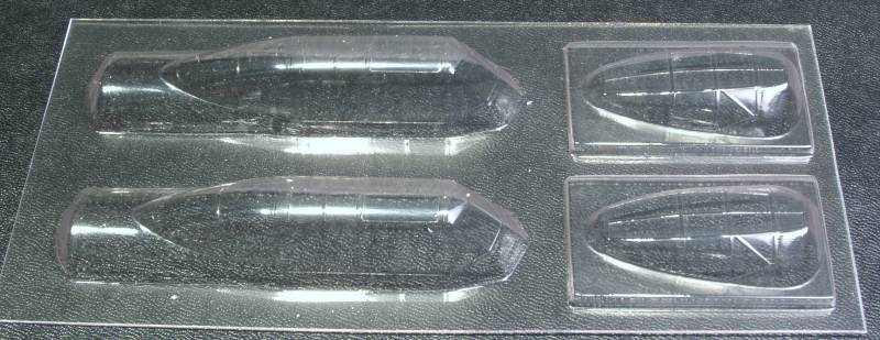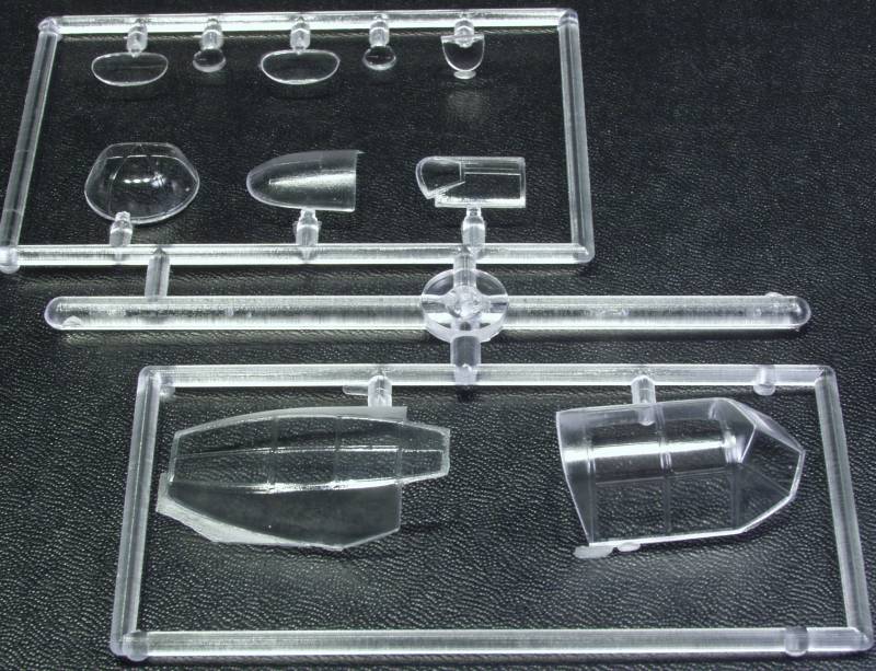 The clear parts are supplied as injected for the versions with turrets and vacuformed for the Pe-3 versions. The injected parts are moderately thin and reasonably clear with well defined frame lines. The vacuformed parts are not as clear as I would like but the frames lines are well defined and they should look OK with a coat of future. There are 10 injected parts and 4 (two of each part) vacuform parts. See below.