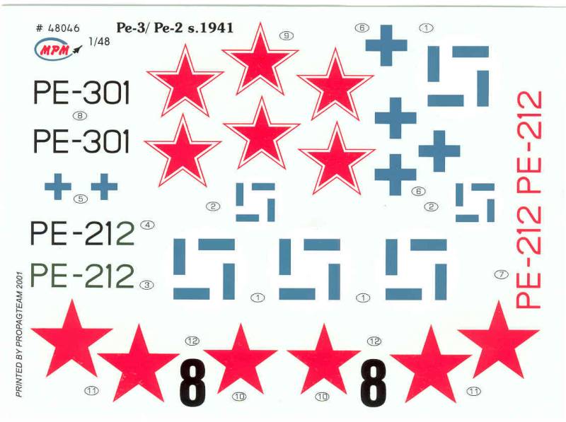 The decals are thin and glossy and are in register but I have some doubts as to the opacity of the red in the stars. Marking are supplied for four aircraft, one each Pe-2 and Pe-3 in Soviet and Finnish markings. See below.