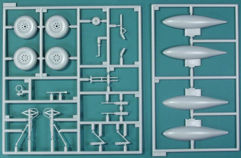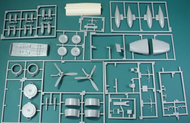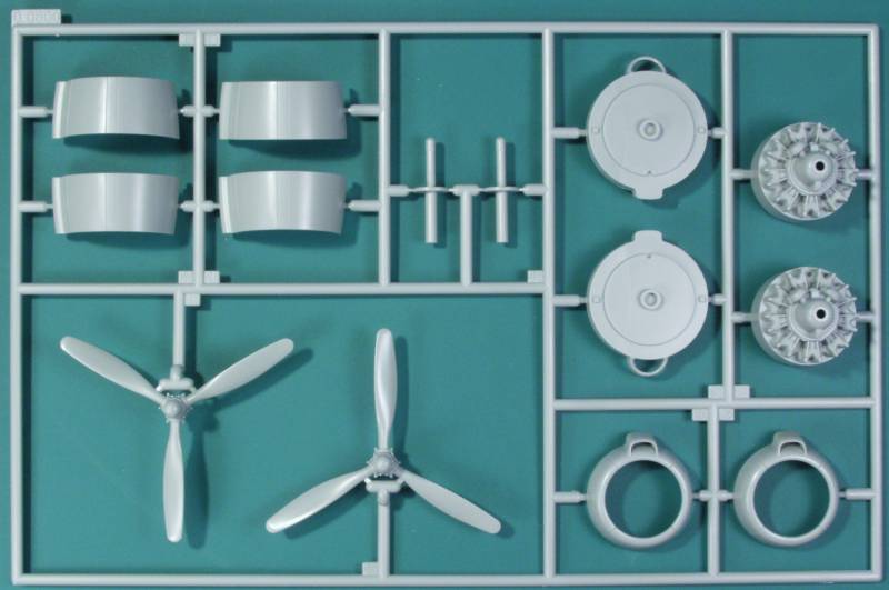 The engines are molded as one piece with integral push rods. Probably adequate as the cowls are pretty tight fitting. Probably the biggest short coming of the kit is the propeller blades which are too narrow in cord as a result of Revell using a restored Canadian aircraft as their pattern for the kit. Fortunately the after market folks have come to the rescue and these will be discussed later.The turret interior is pretty simple and would probably benefit from some additional detail. The gun barrels aren't bad but are not hollow ended and would look better replaced with metal barrels. A set of under wing fuel tanks is supplied, if you don't want to use them you will need to fill the slots and recesses in the bottoms of the wings. The main gear are nicely molded with very petite integral brake lines. The main wheels are not weighted and feature a diamond tread. All of the parts are nicely molded and I could only find a small amount of flash. Mold parting lines are tolerably light. The box states that the kit contains 143 parts in gray and there are 15 clear parts. Sprue photos are below