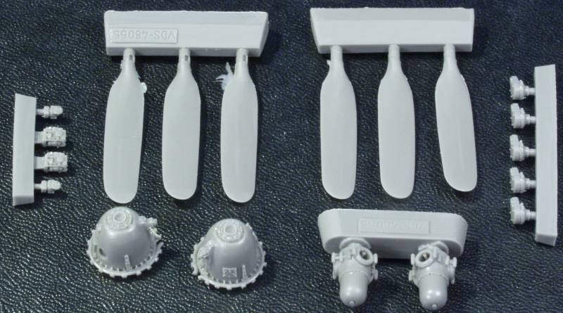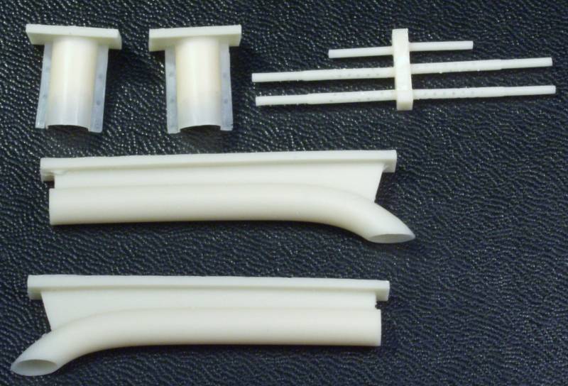 There are ten small resin parts, six gun barrels, and two flame dampening exhausts made up of a forward piece with an air intake and a rear piece. The parts are cleanly molded with a hint of flash. No surface defects were found. The gun barrels are OK but I think I may replace them with metal barrels.