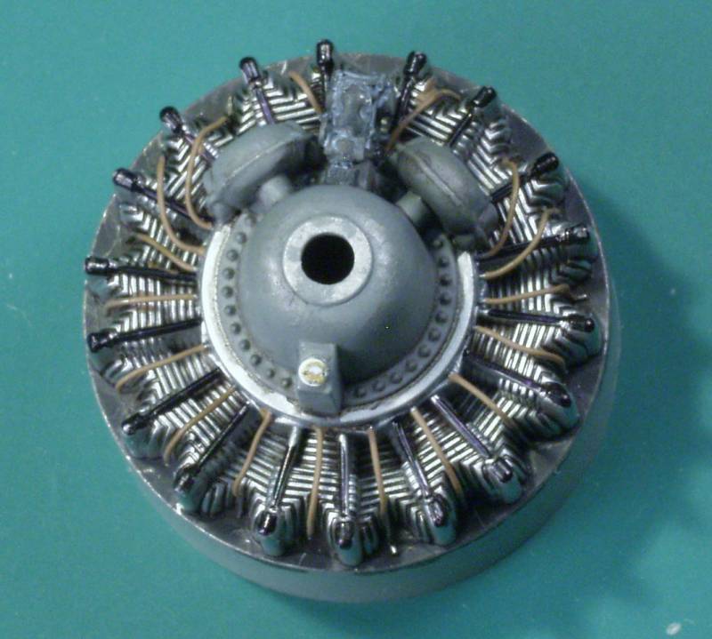 Since it's not all that easy to see once in the cowling I decided to take a different route. I went with the kit part, added some token wiring and added the prop controls and called it a day. Due to the way the part was molded in one piece doing a prototype wiring job was really not possible so I added just enough that when view from the front it gives the impression of wiring or at least I hope so. The push rod tubes were done with a Sharpie.